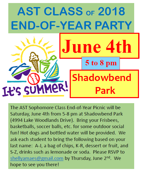 CLASS OF2018 END-OF-YEAR PARTY June 4th 5 to 8 pm @Shadowbend Park