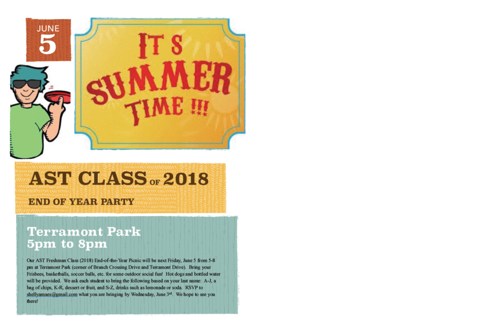 The AST Freshman Class (2018) End‐of‐the‐Year Picnic will be Friday June 5 from 5‐8 pm at Terramont Park (corner of Branch Crossing drive and Terramont Drive)