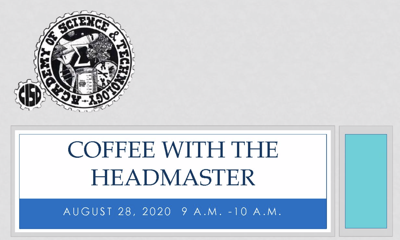 *Virtual*VirtualDr. Caffery created a Module in the Academy General Canvas course titled Coffee with the Headmaster. Download Dr. Caffery's presentation HERE Dr. Caffery will open a Zoom meeting for Questions and Answers on Friday, Sept. 4 at 9:00 a.m.